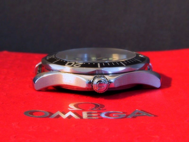 | The case The case of the full-size is just right for men's arms. I can recommend everyone who is afraid of the 41mm case (size of the bezel) to see the full- and mid-size in real-life. Once you've had the full-size on your wrist, the mid-size looks unnaturally small. They are both smaller in reality than one would expect. The case is 11.5mm thick but looks rather flat because the edges of the caseback are beveled. It has a very "streamline" look when sitting on the wrist. The "crown" at 10 o'clock is a helium release valve. It's only useful for deep sea saturation diving and completely irrelevant for office divers like me, and even "regular" divers have no use for it. It's not a whole lot more than a gimmick to distinguish the SMP from other diving watches. Here's an article at timezone.com explainig the gory details. |
