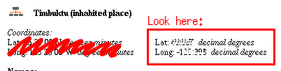 7. After clicking the name, you'll be taken to the Full Record Display screen. Look for the Coordinates section. You'll need to know the decimal degrees part of that section. If one or both numbers has a '-' prefix (meaning it is a negative number), that's important. Remember to include the '-' in your submission.